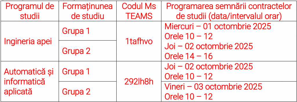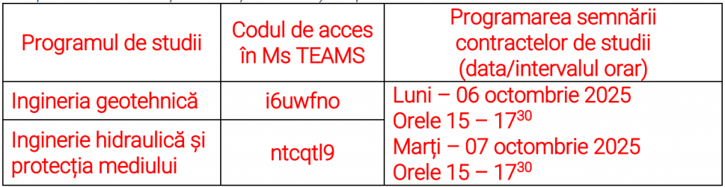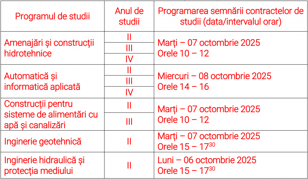 Studenții din anii II, III și IV la studiile de licență și anul II la studiile de masterat din cadrul Facultății de Hidrotehnică la forma de finanțare cu taxă sunt așteptați să semneze contractul de studii, respectiv actul adițional după cum urmează: